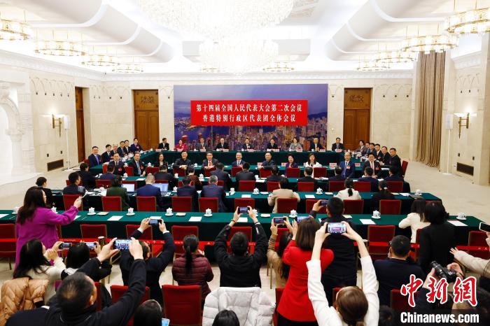 3月6日,出席十四届全国人大二次会议的香港特别行政区代表团举行开放团组会议。图为会议前,与会代表面向媒体亮相。 中新社记者 韩海丹 摄