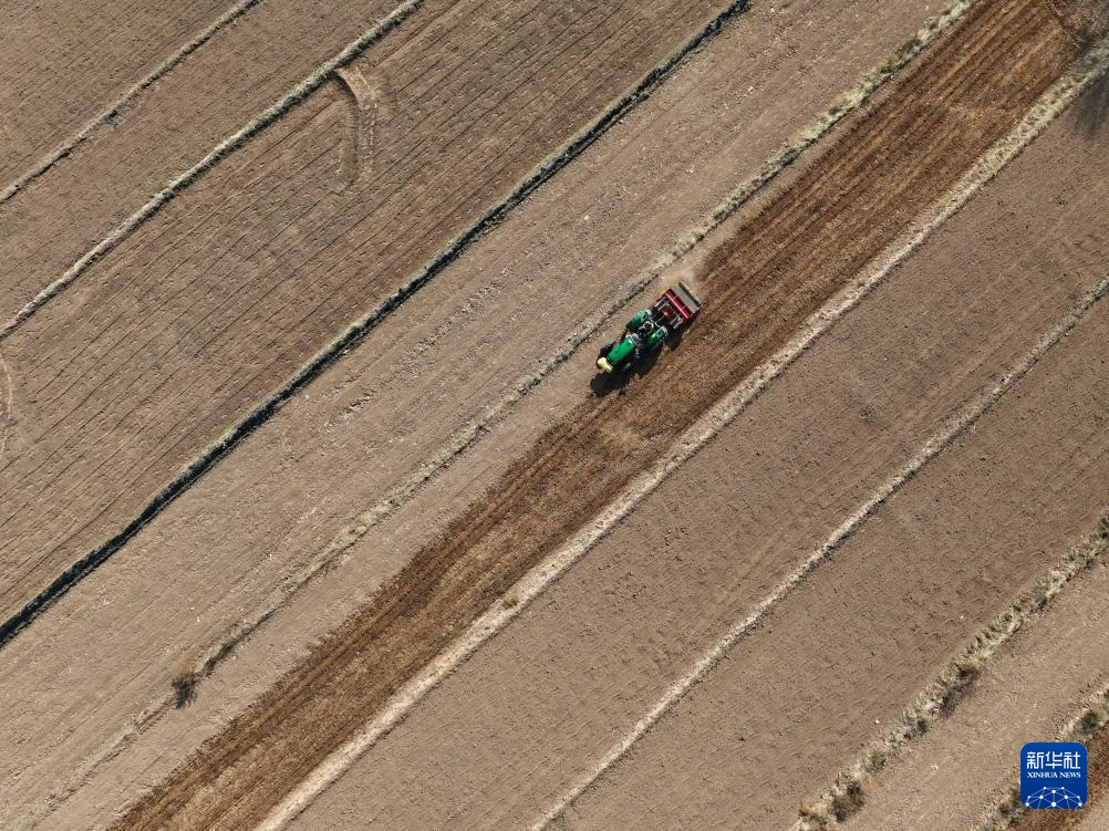 3月7日,青海省海东市民和回族土族自治县中川乡光明村村民在耕地播种(无人机照片)。新华社记者 张龙 摄
