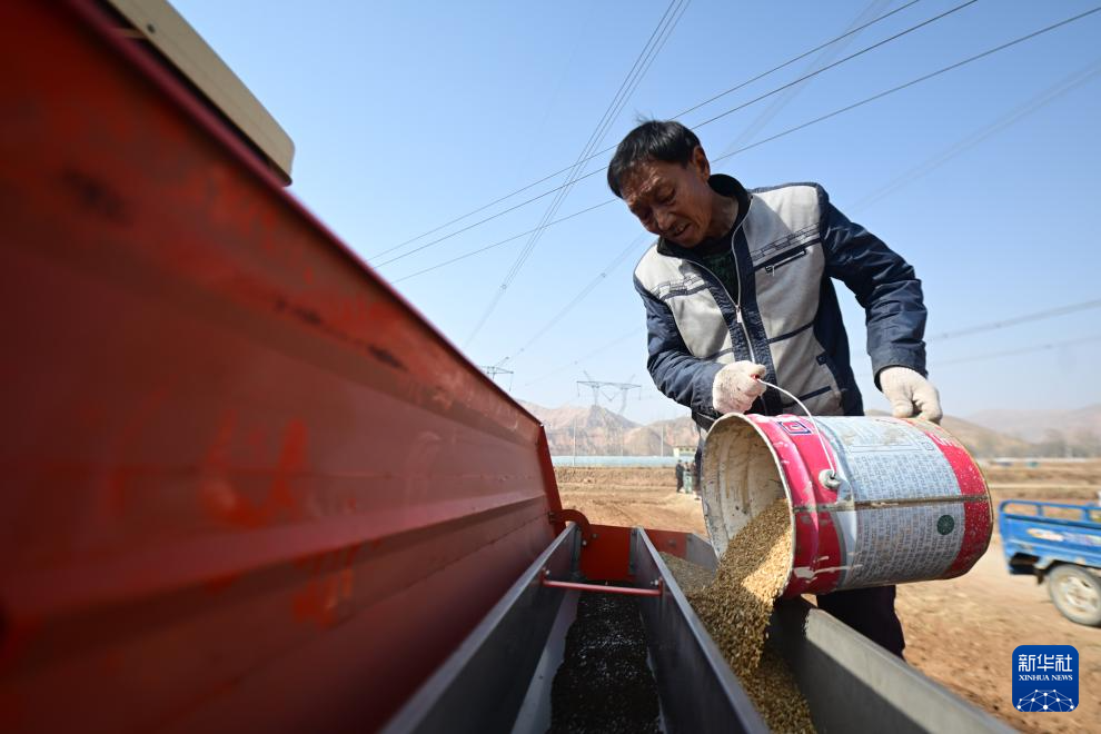 3月7日,青海省海东市民和回族土族自治县中川乡光明村村民往播种机内撒种。新华社记者 周盛盛 摄