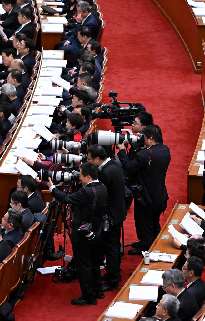 3月9日,全国政协十四届二次会议在北京人民大会堂举行第三次全体会议。这是记者在采访。新华社记者 陈晔华 摄