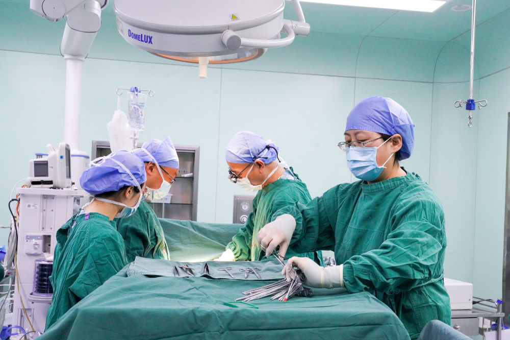 在吉林省长春市儿童医院,护士王晓杰(右一)在手术室协助医生对患儿进行手术(2023年5月10日摄)。新华社记者 颜麟蕴 摄