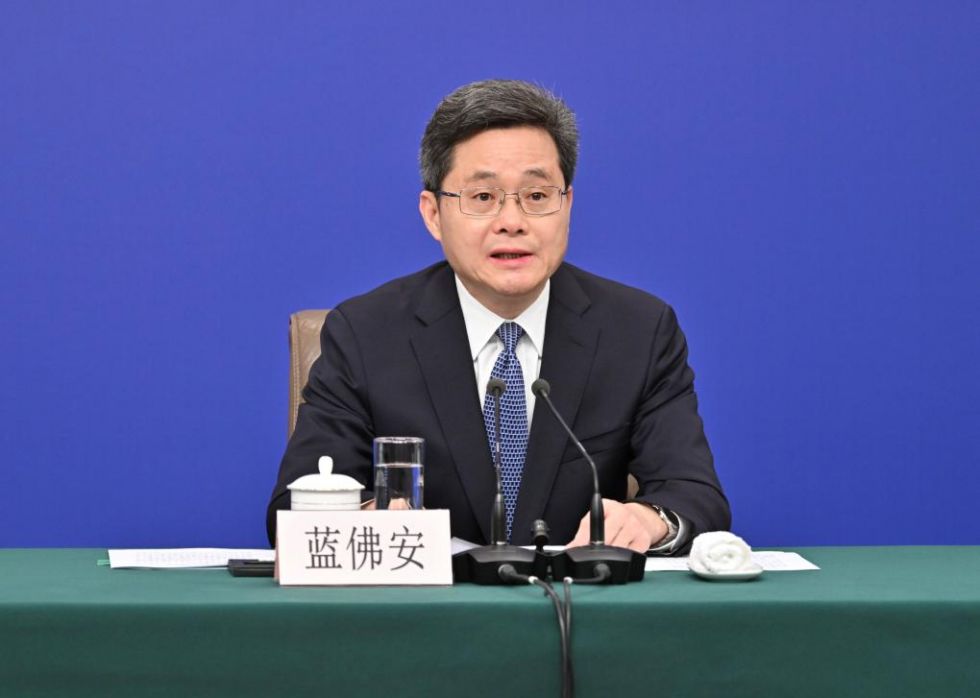(财政部部长蓝佛安回答记者提问。新华社记者 李鑫 摄)