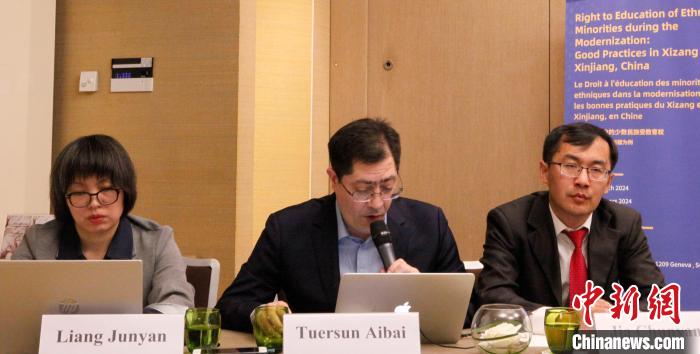 联合国人权理事会第55届会议期间,中国人权研究会当地时间14日在瑞士日内瓦举办“现代化发展中的少数民族受教育权——以中国西藏和新疆为例”主题边会。 图为中国人权研究会副秘书长王琰文(图左)主持边会。 中新社记者 德永健 摄