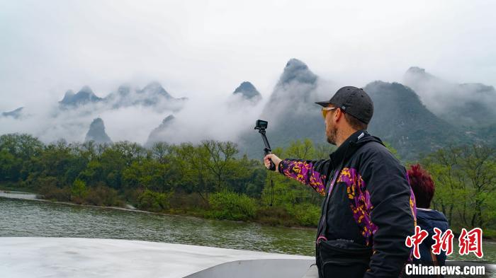 3月15日,在广西桂林漓江上,外媒记者记录烟雨漓江之美。蒋丰慧 摄