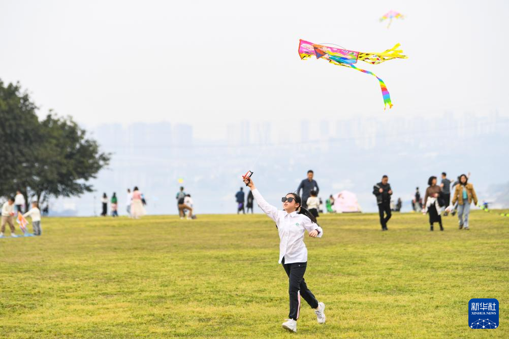 3月16日,小朋友在重庆广阳岛东岛头放风筝。新华社记者 王全超 摄