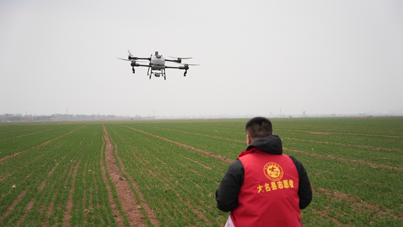 一路向西南,在河北省邯郸市大名县堤上村的田地里,“飞手”们正操控农业植保无人机按照既定航线在田地里飞行穿梭,为小麦进行喷洒作业。