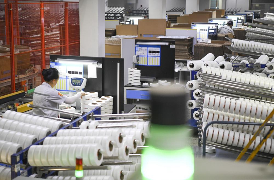 工人在华峰重庆氨纶公司包装车间作业(2023年10月16日摄)。新华社记者 王全超 摄