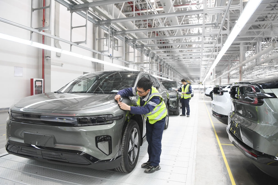 2024年3月14日,工作人员在长安汽车重庆渝北新工厂总装车间进行整车下线前的检查。新华社记者 王全超 摄