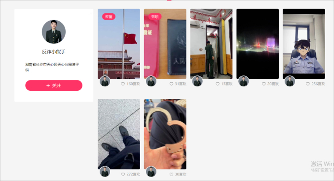 且其账号主页使用“湖南省长沙市天心区天心分局坡子街”为个人简介以及其他多条视频内含警官证、警服、手铐等敏感要素。