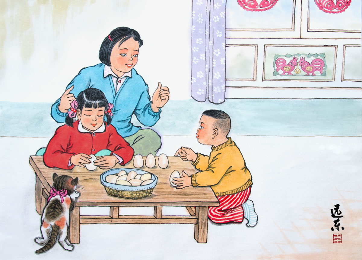 人们把新鲜鸡蛋轻轻竖立在桌面
