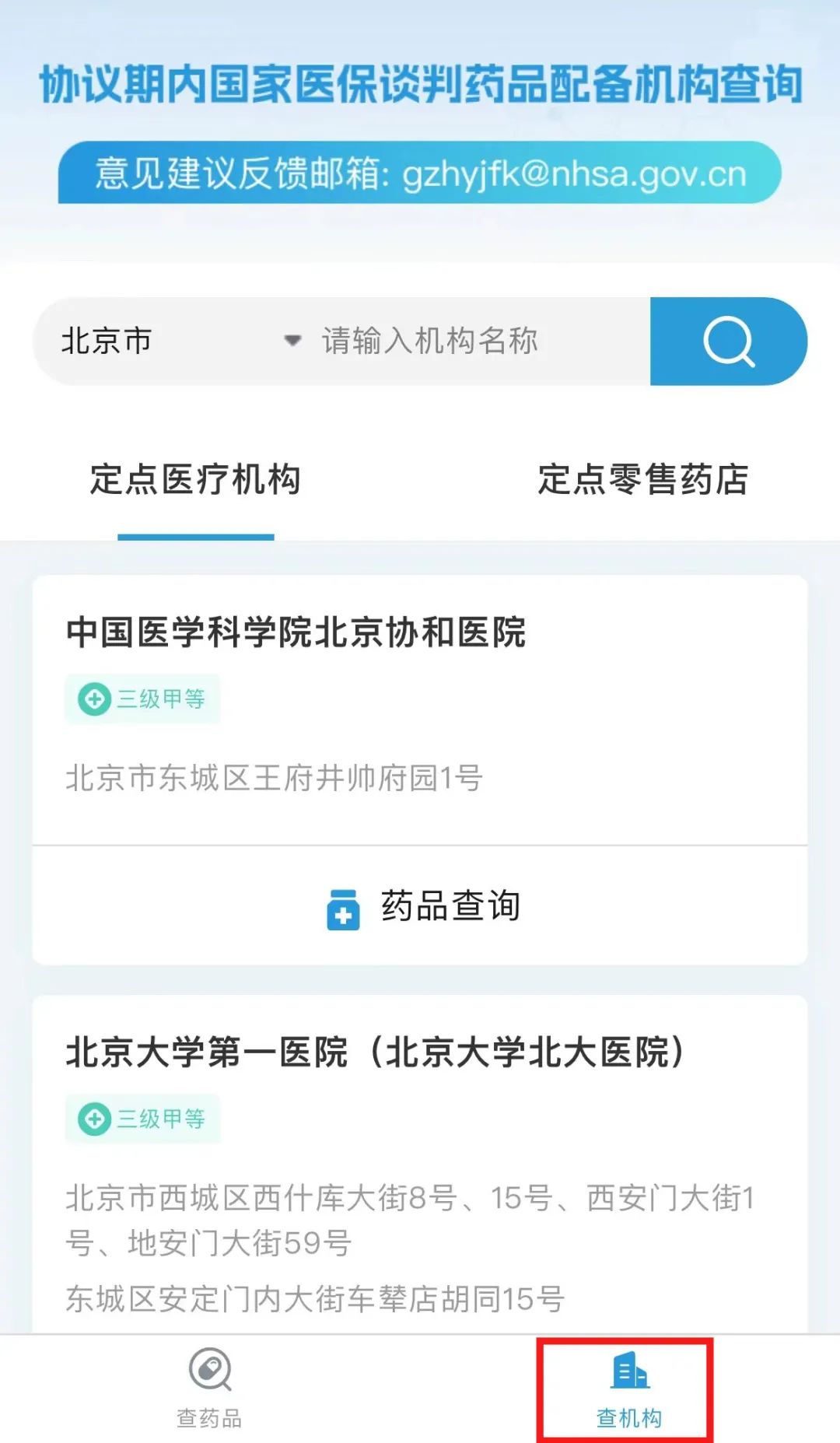 同时,您也可以点击页面下方“查机构”,进入“定点医疗机构”或“定点零售药店”页面,确定具体的医疗机构或零售药店后,点击“药品查询”,了解该机构配备的全部“国谈药”情况,如下图所示。