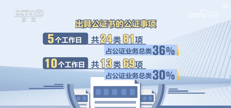 其中,受理之日起5个工作日内出具公证书的公证事项共24类81项,10个工作日的共13类69项,分别占公证业务总类的36%和30%。