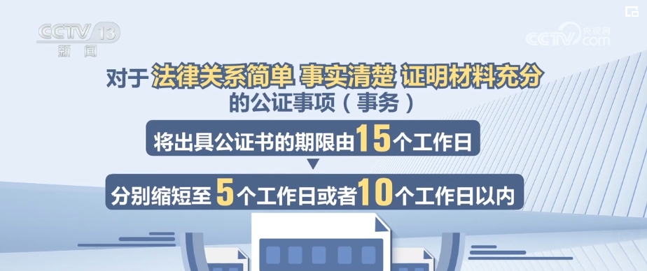 司法部相关负责人介绍,司法部于近期制定了公证办理提速清单(2024年版),对于法律关系简单、事实清楚、证明材料充分的公证事项(事务),将出具公证书的期限由15个工作日分别缩短至5个工作日或者10个工作日以内。