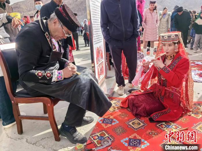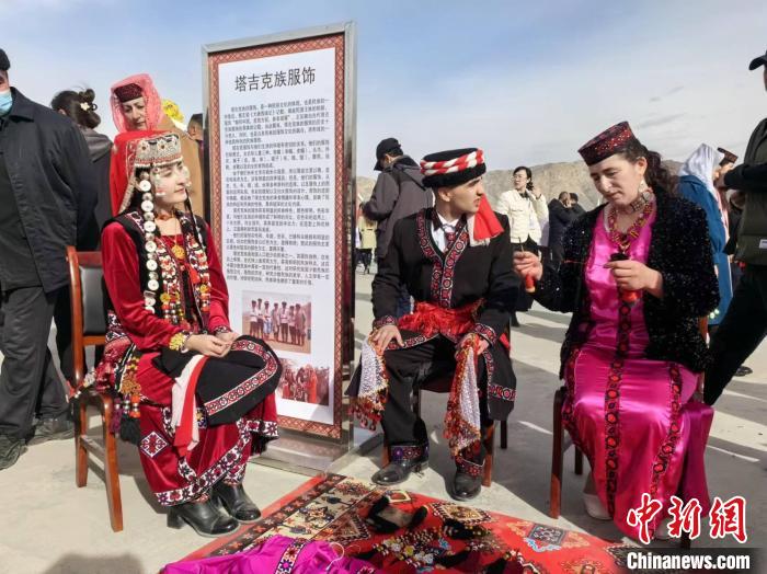 3月21日,新疆塔县举行非物质文化遗产及传统体育展示展演活动。图为在“非遗”展示区内,当地民众正在为游客现场展示国家级非物质文化遗产,塔吉克族服饰。马晓东 摄