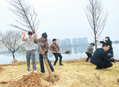 清晨,在汉川天屿湖畔,鄂台青年两三人一组,挥锹挖土、扶苗培根、浇水挂牌……大家分工协作,不一会儿,一株株水杉亭亭玉立。
