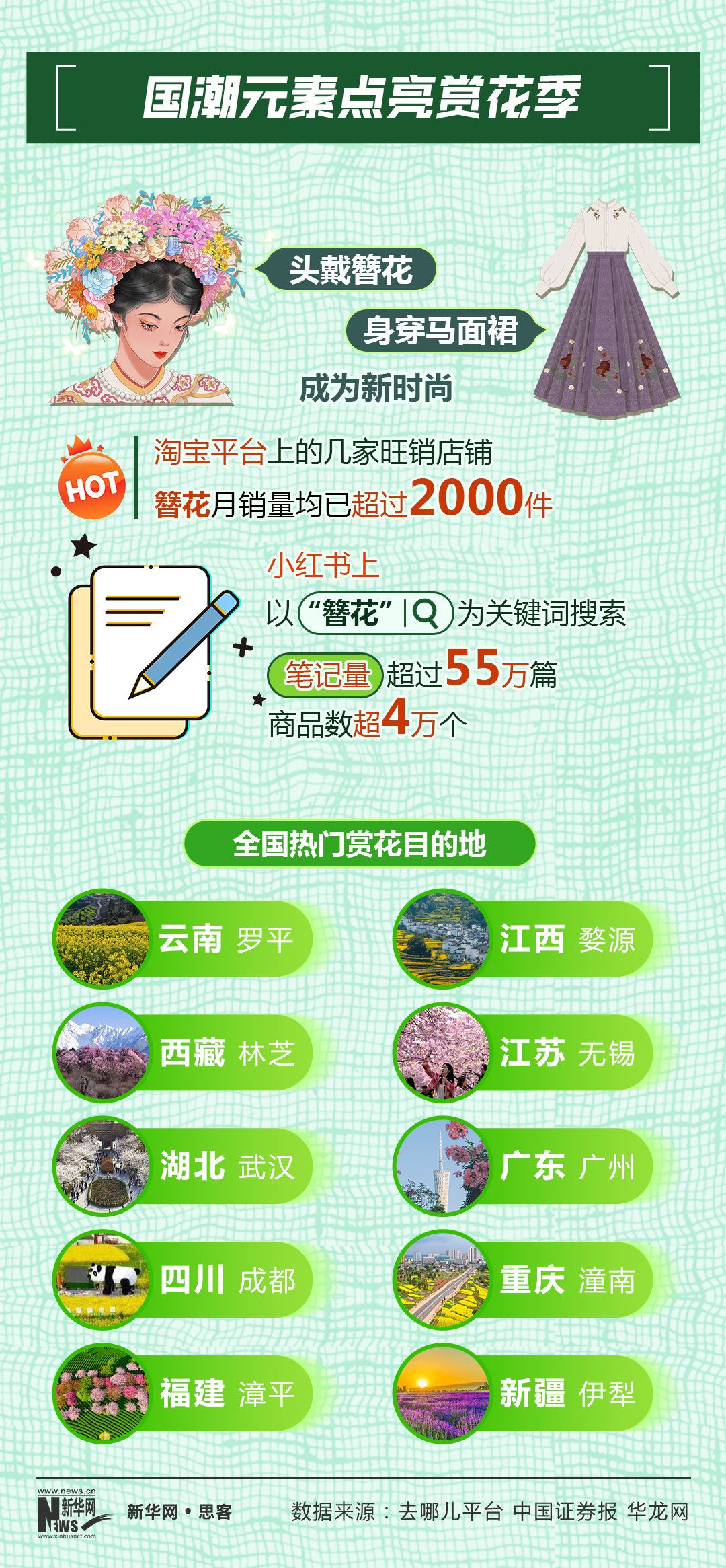与往年不同的是,头戴簪花,身穿马面裙赏花成为今年的新时尚。有网友表示“簪花和马面裙既传统又现代,适合现代人的需求。头戴簪花,身穿马面裙赏花,别有一番风味,拍照也十分出片”。在某电商平台几家旺销店铺里,簪花月销量均超过2000件。小红书上以“簪花”为关键词搜索,笔记量超过55万篇,商品数超4万个。