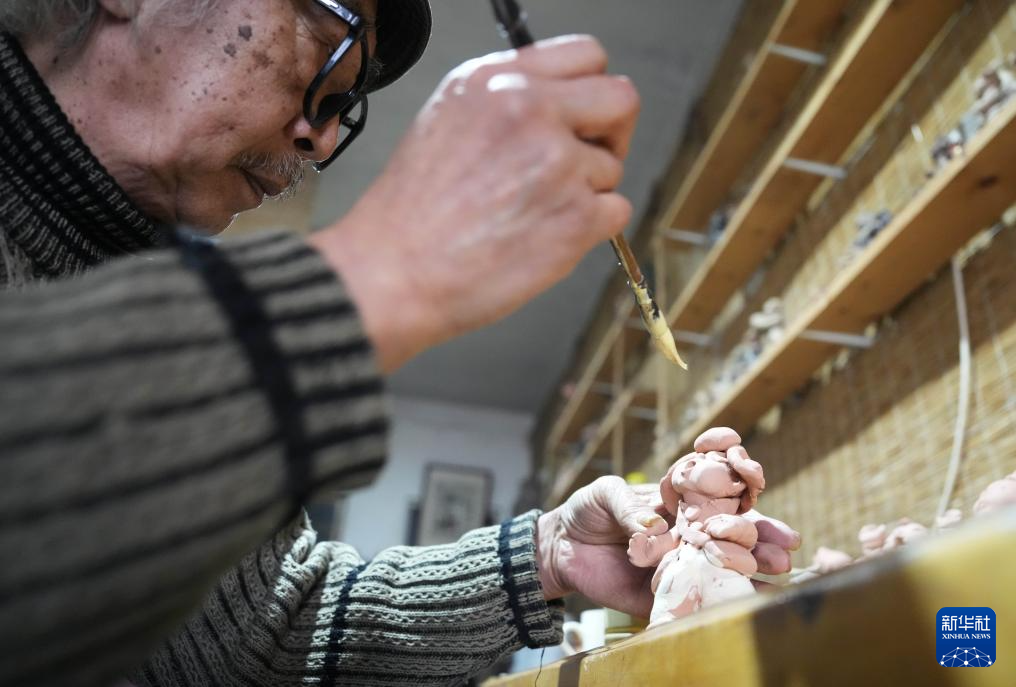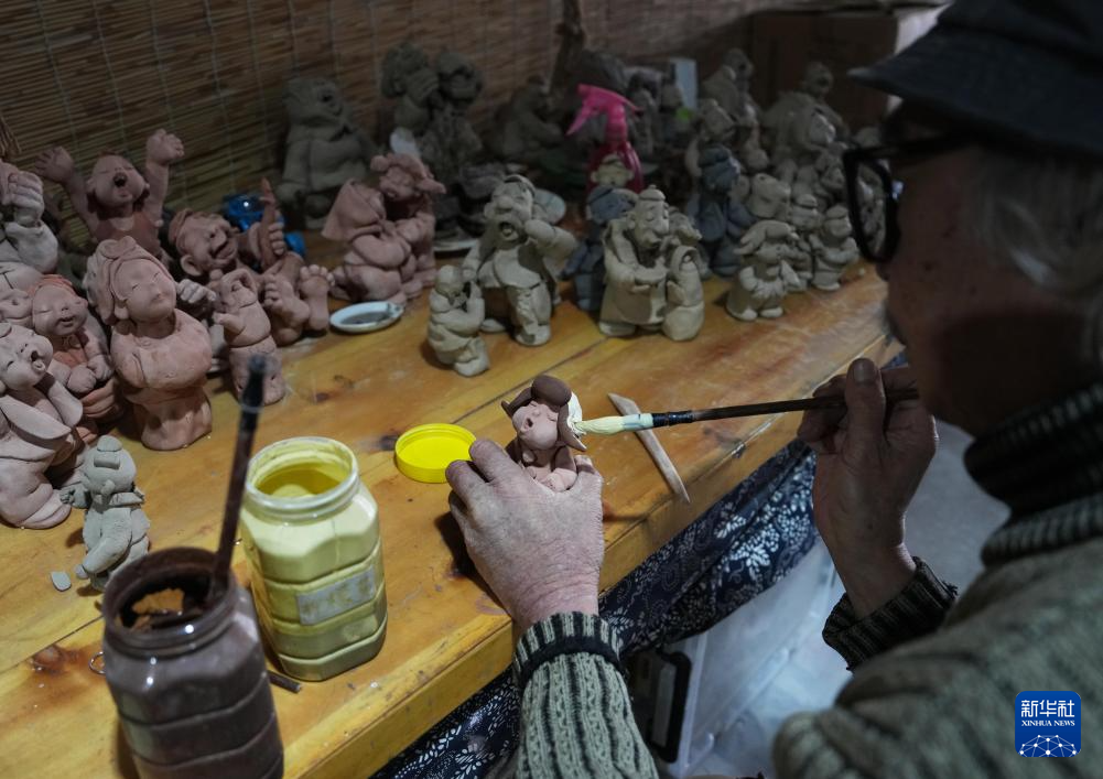3月21日,王辰在工作室给泥人上色。新华社记者 李钢 摄