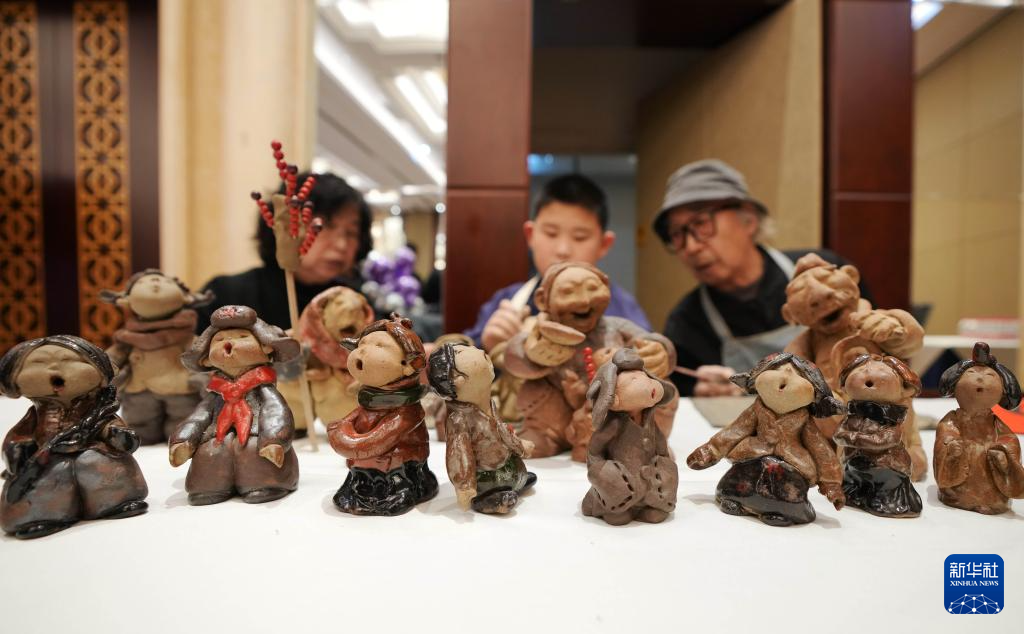在沈阳一个新春活动上,王辰(后右)和家人一起展示泥人制作技艺(1月17日摄)。新华社记者 李钢 摄