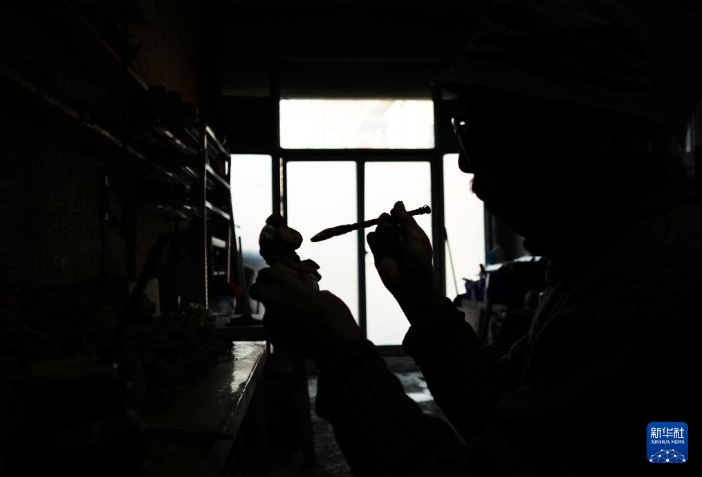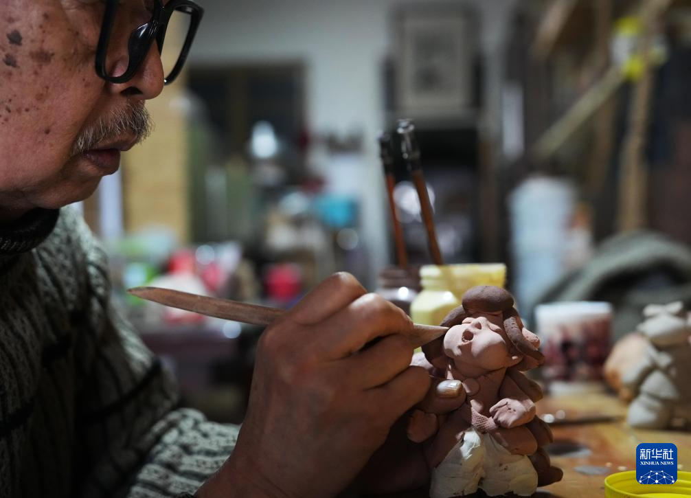 3月21日,王辰在工作室雕琢泥人。新华社记者 李钢 摄