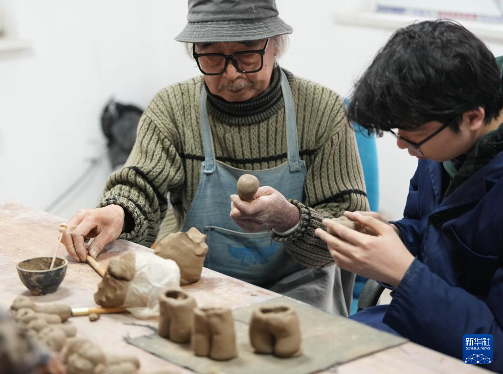 3月22日,王辰(左)在工作室指导学生制作泥人。新华社记者 李钢 摄