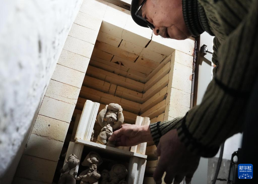 3月21日,王辰在工作室将做好的泥人放入窑内准备烧制。新华社记者 李钢 摄