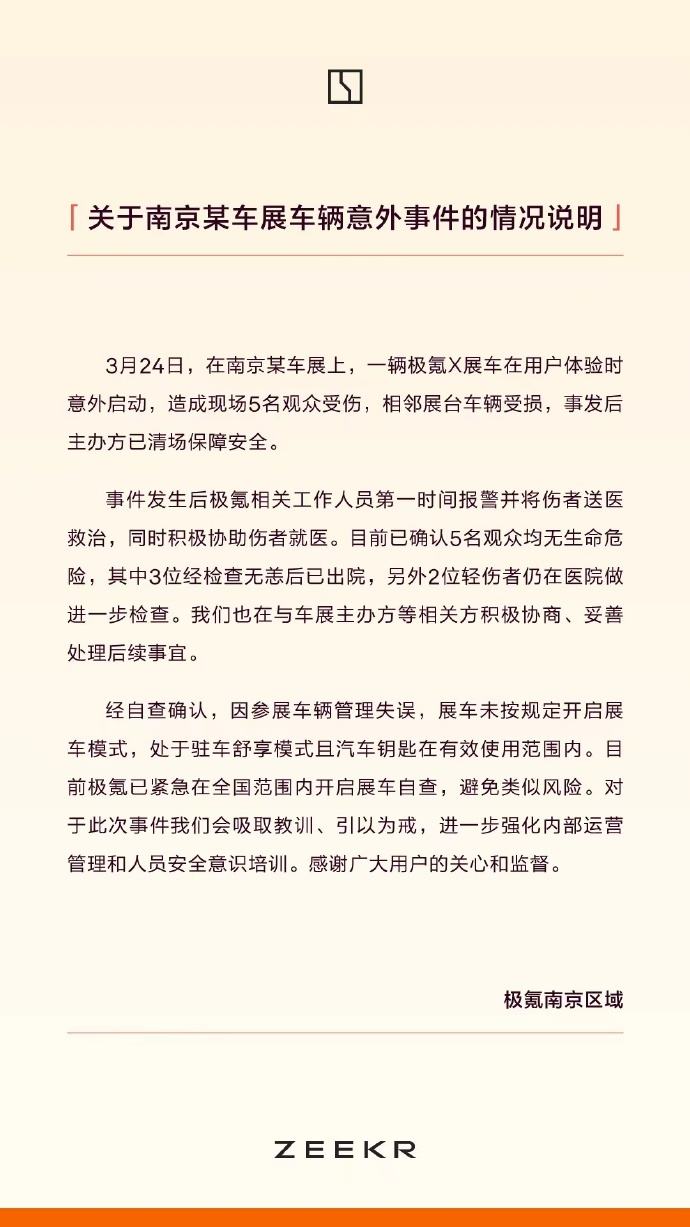 3月24日晚,极氪在其官方微博发布关于南京某车展车辆意外事件的情况说明。其中提到,一用户在南京某车展上意外启动车辆,造成5人受伤,相邻展台车辆受损。