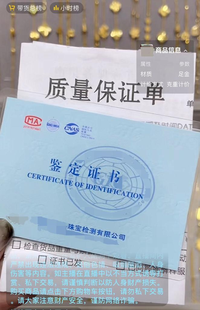 图为某平台店铺主播展示其所售黄金产品的“鉴定证书”。