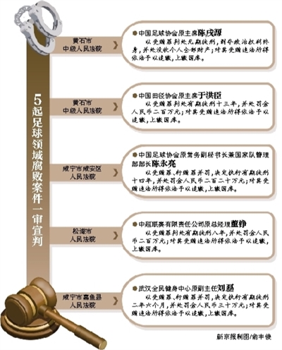 3月26日,中国足协原主席陈戌源案等5起足球领域腐败案件在湖北黄石等地法院一审宣判,对被告人陈戌源以受贿罪判处无期徒刑,剥夺政治权利终身,并处没收个人全部财产;对被告人于洪臣以受贿罪判处有期徒刑十三年,并处罚金人民币二百万元;对被告人陈永亮以受贿罪、行贿罪并罚,决定执行有期徒刑十四年,并处罚金人民币二百二十万元;对被告人董铮以受贿罪判处有期徒刑八年,并处罚金人民币二百万元;对被告人刘磊以受贿罪、行贿罪并罚,决定执行有期徒刑二年六个月,并处罚金人民币三十万元。对五被告人受贿违法所得均依法予以追缴,上缴国库。