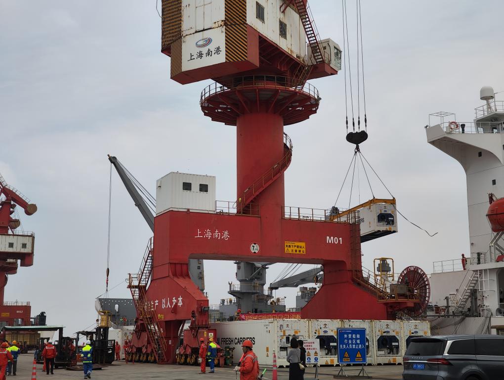 3月26日,装载2100多吨新西兰佳沛新鲜奇异果的“科槐号”散装水果冷藏货船靠泊上海自贸试验区临港新片区南港码头。新华社记者 杨有宗 摄
