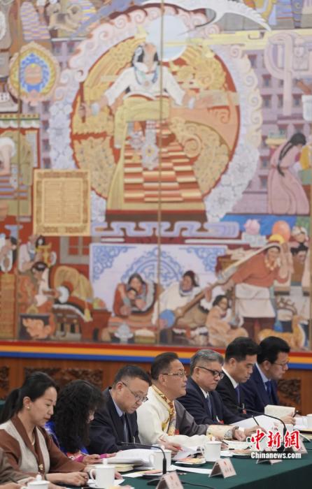 2024年3月6日,出席十四届全国人大二次会议的西藏代表团在北京人民大会堂西藏厅举行开放团组会议,审议政府工作报告并回答记者提问。崔楠 摄