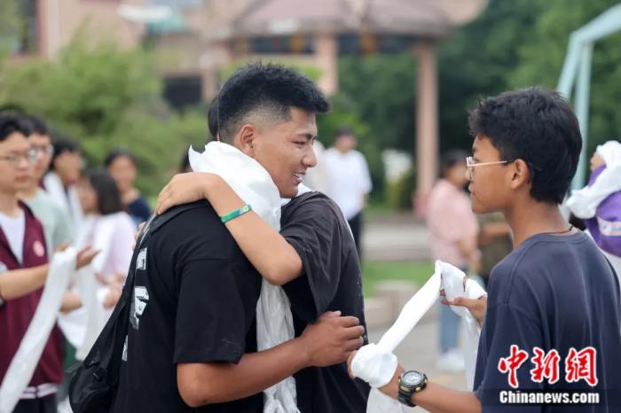 2022年6月,江苏省南通市,南通西藏民族中学高三毕业生在离别前与校友告别。徐培钦 摄