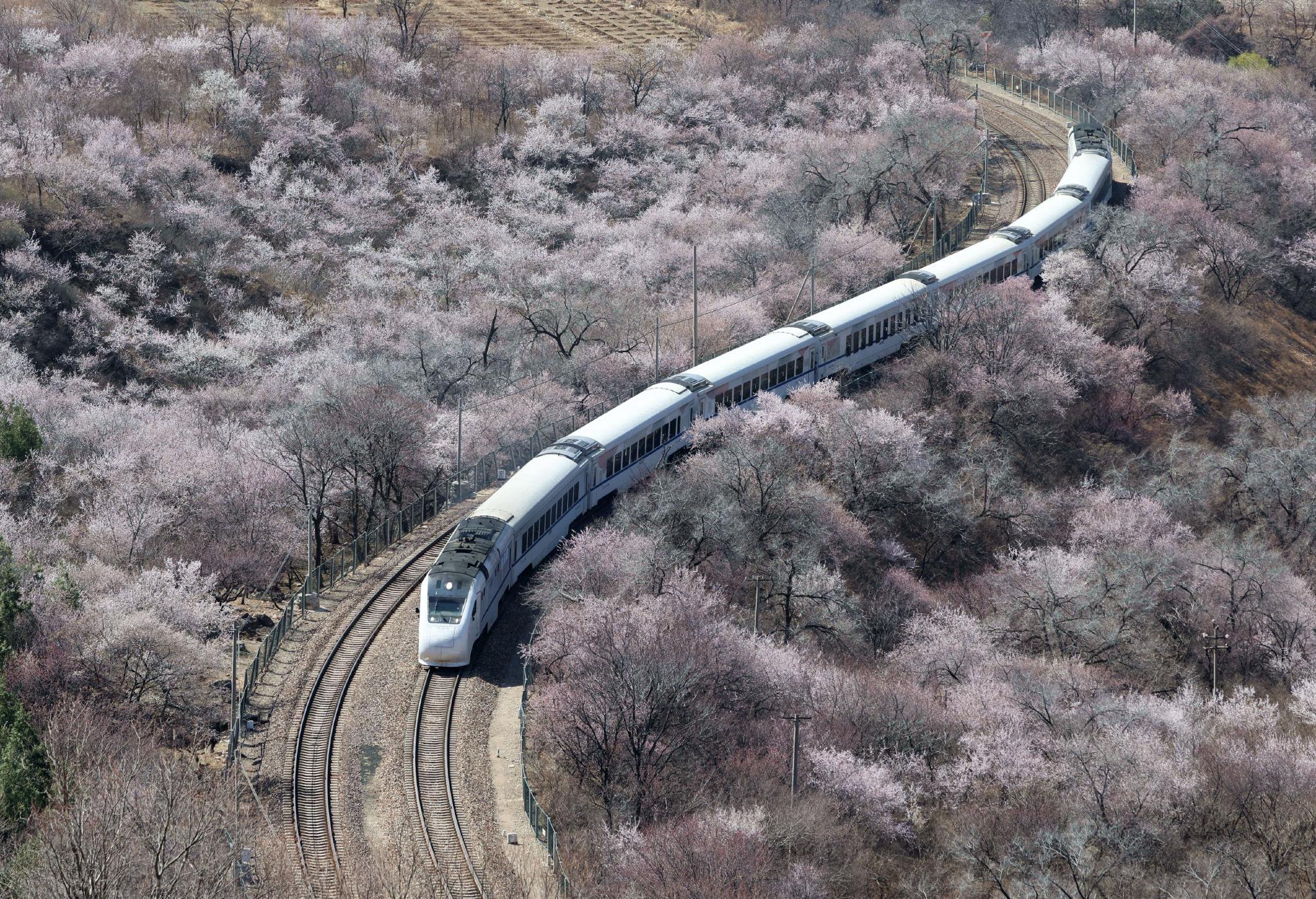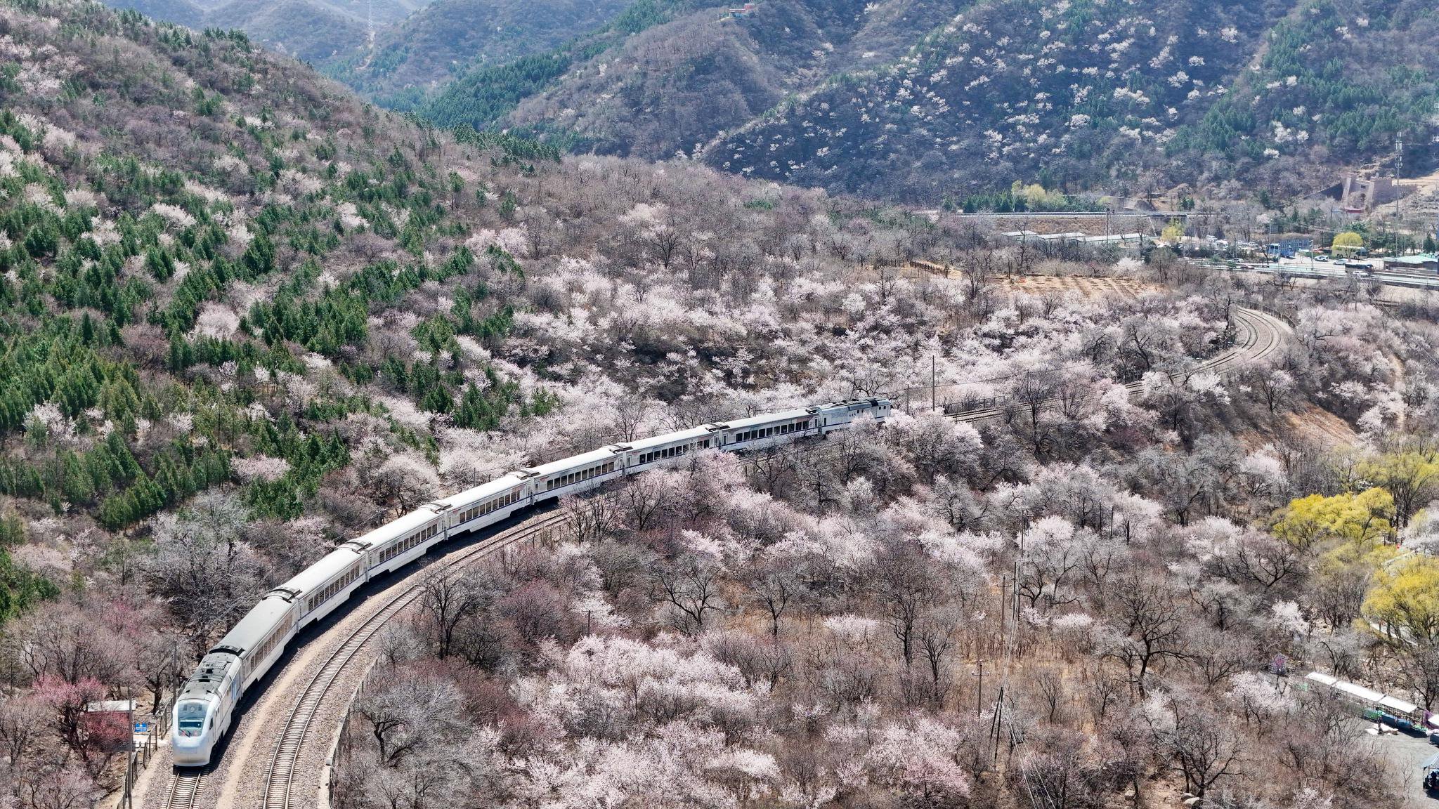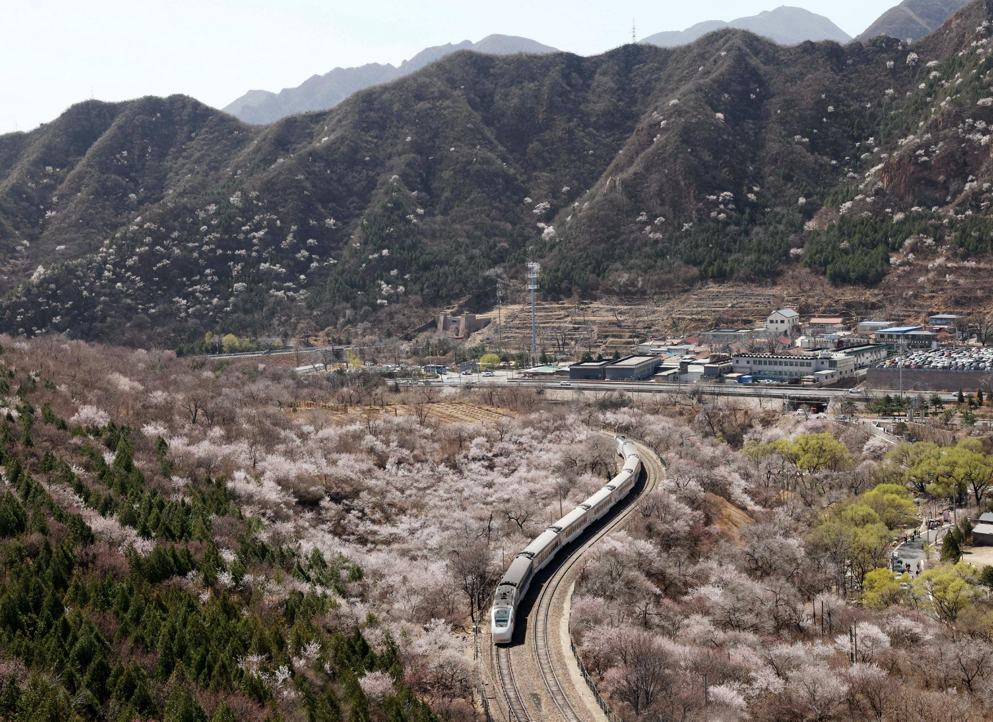 近日,北京居庸关长城脚下的山花渐次开放。北京市郊铁路S2线列车穿行于花海间,成为春日里一道美丽的风景,吸引不少游人前来赏春。