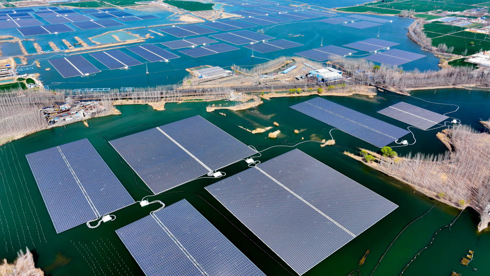 这是山东省济宁市微山县驩城镇利用采煤塌陷区约3600亩水面建设的渔光互补项目(2024年3月20日摄,无人机照片)。该项目集光伏发电、渔业养殖、生态修复于一体。新华社记者 郭绪雷 摄