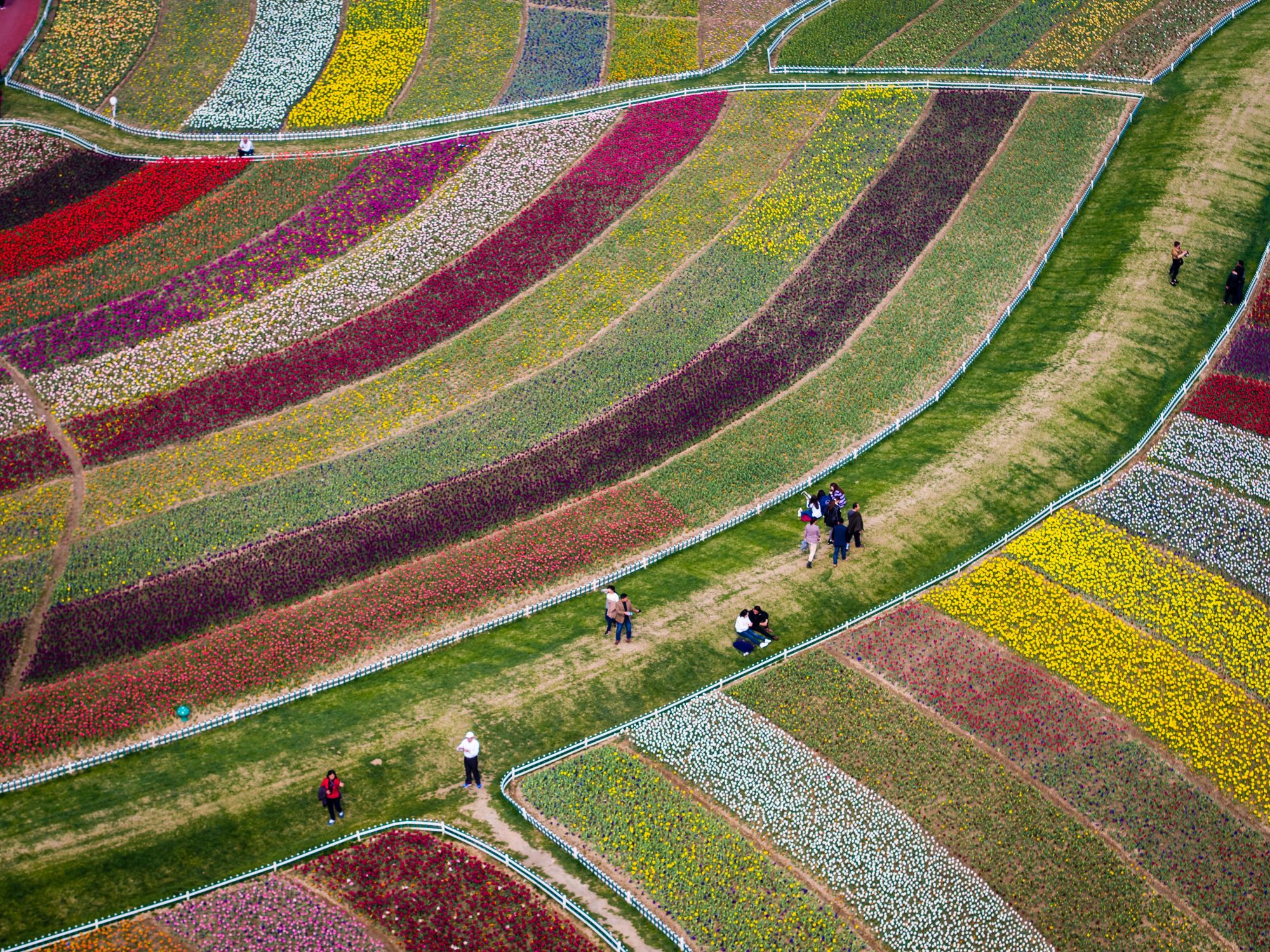 游客在江苏盐城大丰区荷兰花海内赏花游玩(无人机拍摄)。新华社发(杨素平 摄)