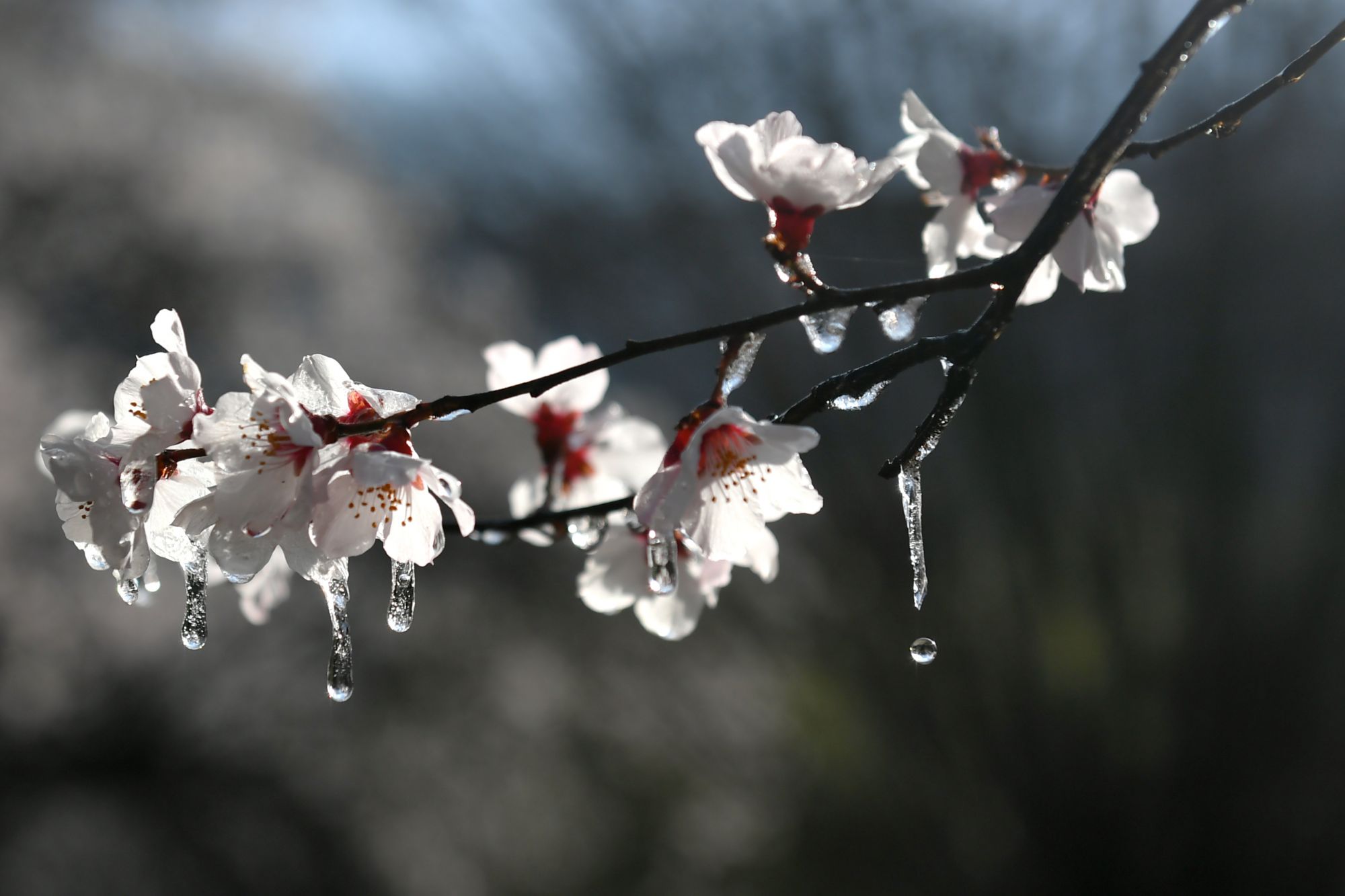 在西藏自治区林芝市,桃花枝头冰冻的露水随着气温升高渐渐解冻、融化。新华社记者 孙瑞博 摄