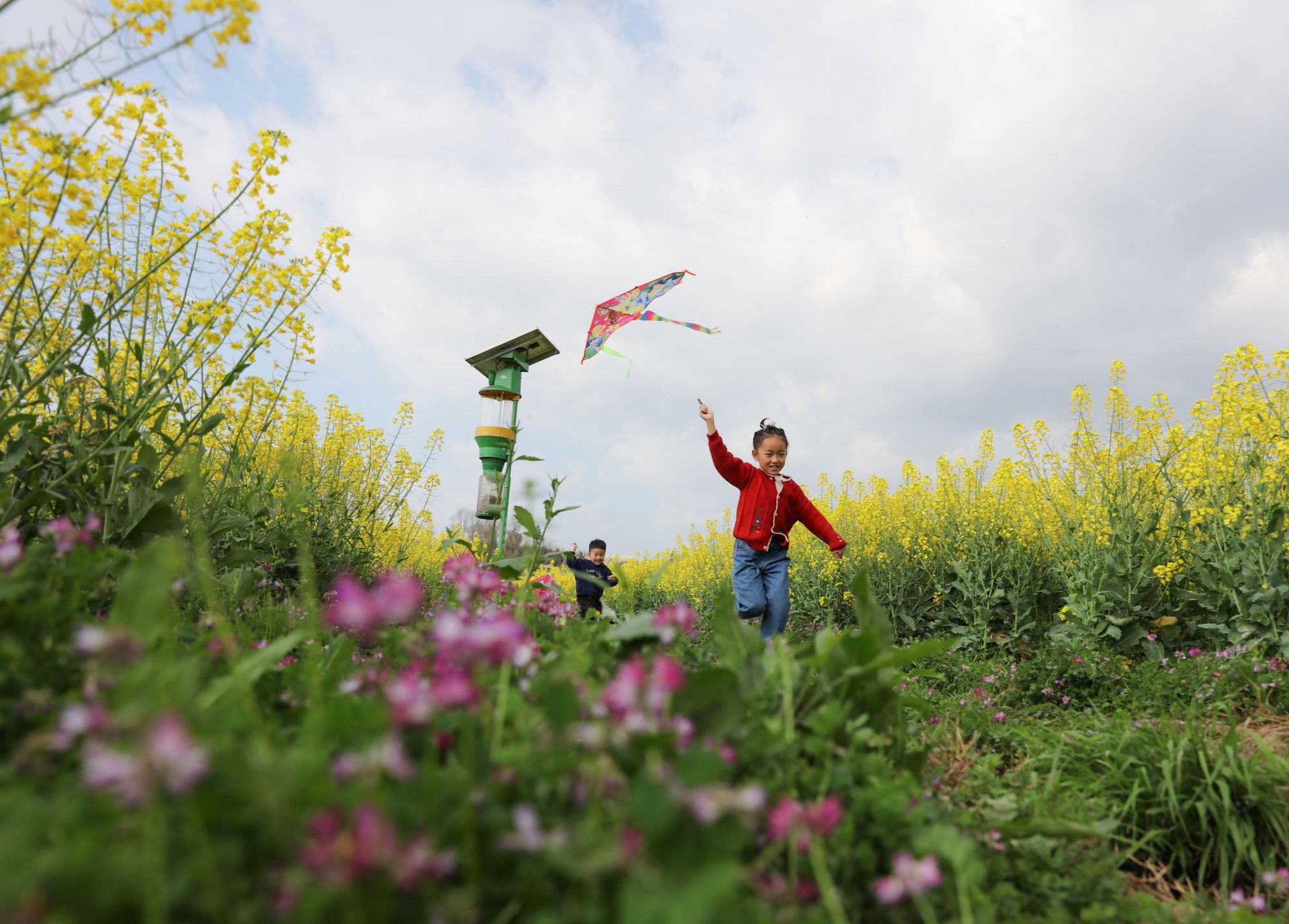3月23日,小朋友在贵州省黔东南苗族侗族自治州施秉县城关镇上翁哨村油菜花田中放风筝。新华社发(磨桂宾摄)