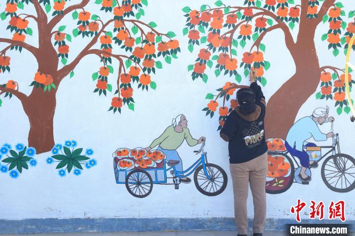 村民正在修补墙上的画作。 娄雅坤 摄