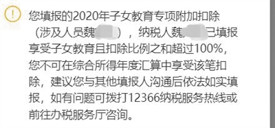 3月19日,蒋璐在个人所得税App上填报子女教育专项附加扣除信息时被通知,“不可在综合所得年度汇算中享受该笔扣除”。系统提示,她女儿瑶瑶(化名)的信息已被纳税人魏某某填报了。