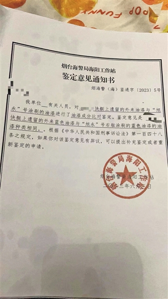 烟台海警局海阳工作站出具的鉴定意见通知书,认为快艇上遗留的外来蓝色油漆与“旭永”号右舷涂刷的蓝色油漆的油漆种类相同。受访者供图