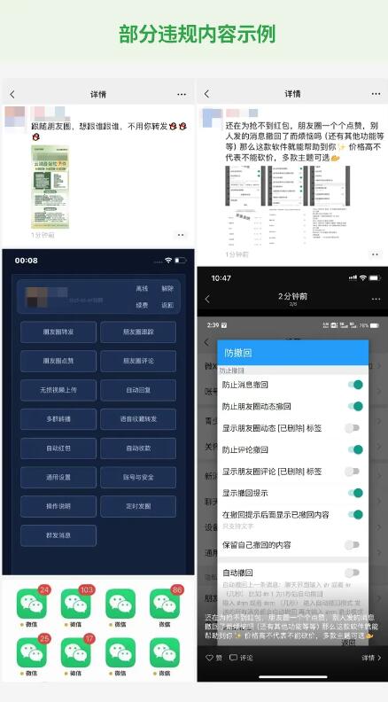 3月26日,微信安全中心发布《针对在微信使用“外挂”行为的打击公告》,《公告》指出,根据《微信个人账号使用规范》规定,微信明确禁止使用各类“外挂”。但近期发现,有部分用户存在多次违规使用“外挂”软件,或在朋友圈发布“外挂”售卖信息的行为。对此,微信安全团队进行了专项清理,并将持续加大清理力度。