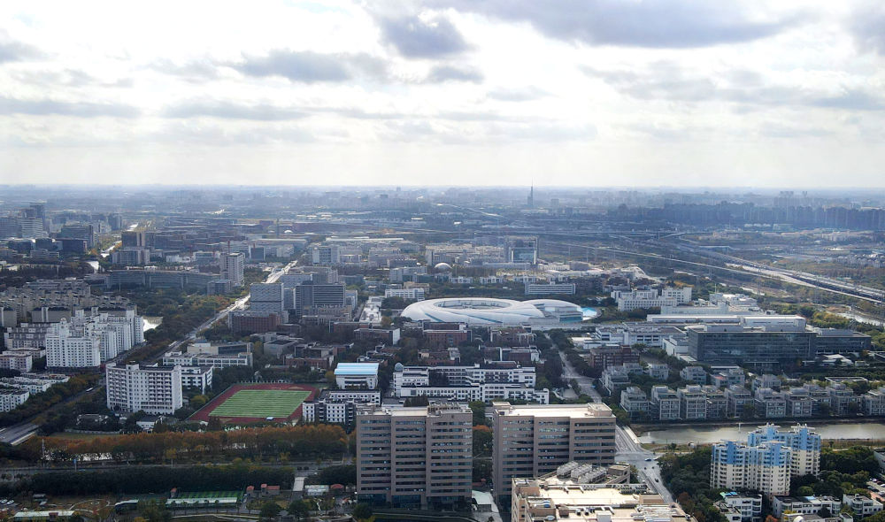 空中远望位于上海浦东新区张江科学城的形如鹦鹉螺的大科学装置上海光源(中)(2023年11月25日摄,无人机照片)。新华社记者 方喆 摄