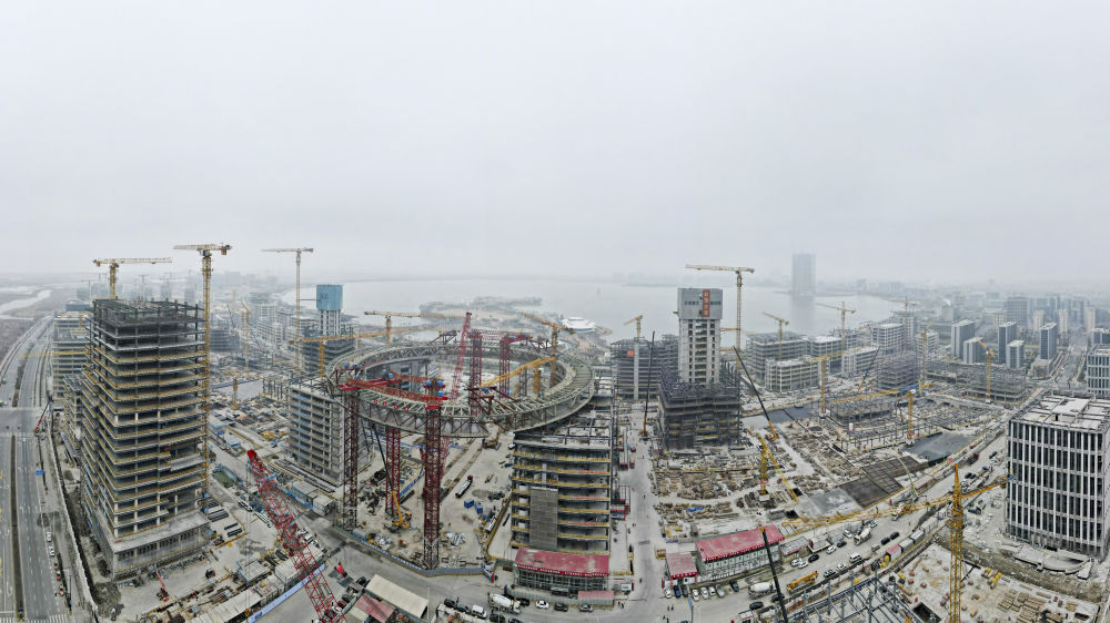 空中俯瞰建设中的上海临港新片区滴水湖金融湾项目(2024年1月18日摄,无人机全景照片)。新华社记者 方喆 摄