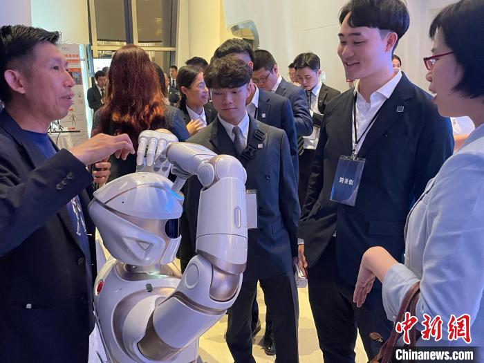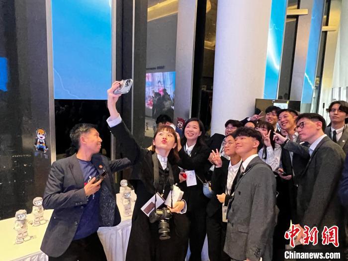 4月1日晚,马英九和台湾青年一行到访深圳平安金融中心,图为台湾青年和智能机器人互动。(深圳市台办供图)