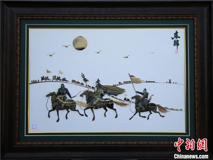 记者看到,根登加甫的作品或为草原题材,或描绘“土尔扈特部东归”历史故事。细看作品可以发现,灰、白、黑等不同颜色的变化,均是巧妙地选取了骨头的自然色彩与肌理。作品《回家》中,根登加甫还使用了银,金属与牛角的结合让作品更有艺术感。