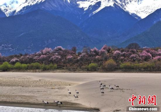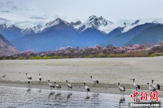 4月,在西藏林芝,远处的雪山、绽放的桃花和水边休憩的黑颈鹤构成一幅和谐美好的春日画卷。图为林芝市派镇拍摄到的黑颈鹤。张宁 摄