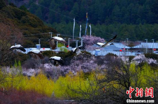 只见,黑颈鹤们伫立在水边,神态悠闲,时而低头觅食,时而抖动双翅,时而翩翩起舞。它们翱翔于桃花与湿地间,人与自然和谐共处的美好场景成为许多人心中的“诗和远方”。图为林芝市巴宜区拍摄到的黑颈鹤。普次 摄