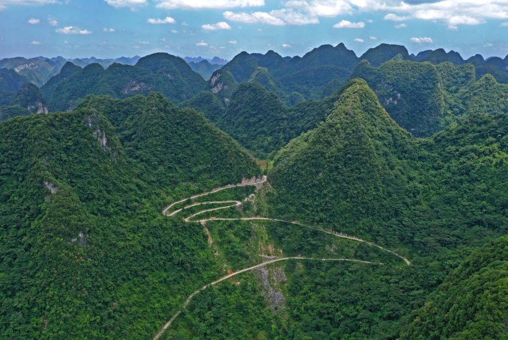 盘山公路穿越漫山翠绿的广西都安瑶族自治县三只羊乡鸡峒村。新华社记者周华 摄