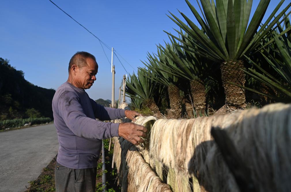 在广西平果市旧城镇康马村,一名村民在晾晒剑麻。新华社记者陆波岸 摄