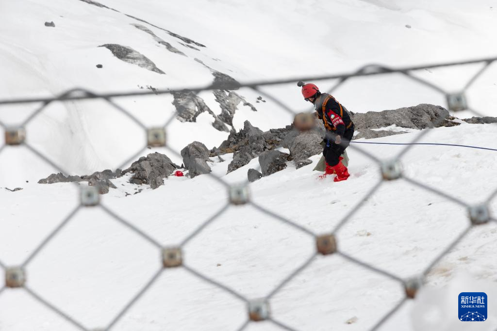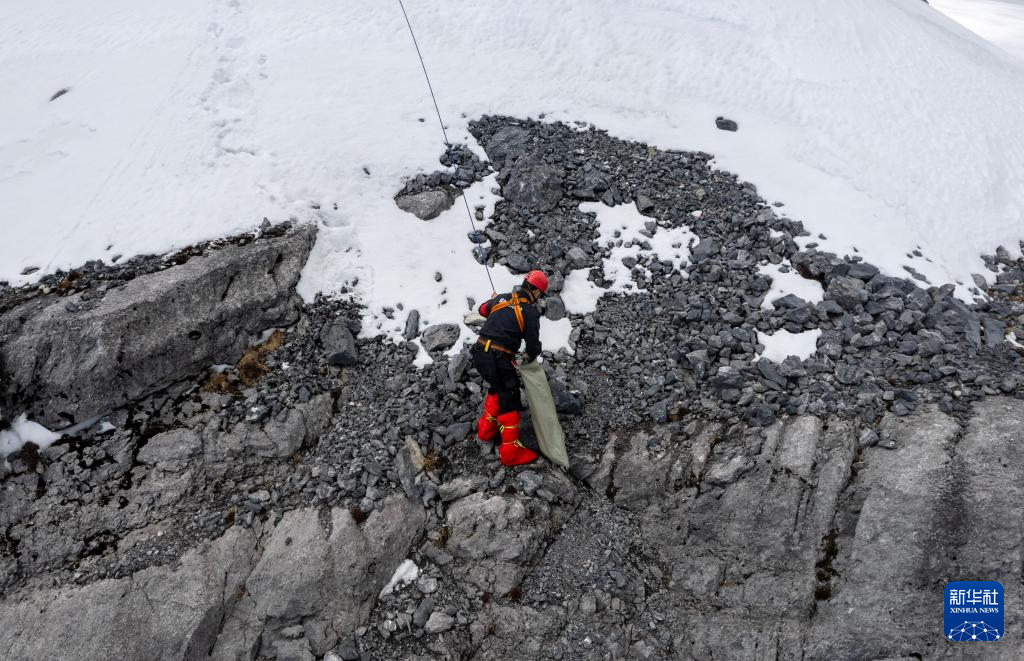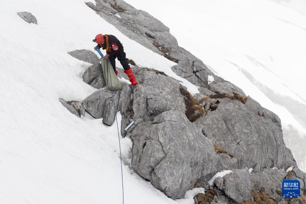 丽江玉龙旅游股份有限公司索道经营分公司景区部保安三组组员吕皓葳在玉龙雪山崖壁上捡拾氧气瓶(3月26日摄)。新华社记者 金立旺 摄