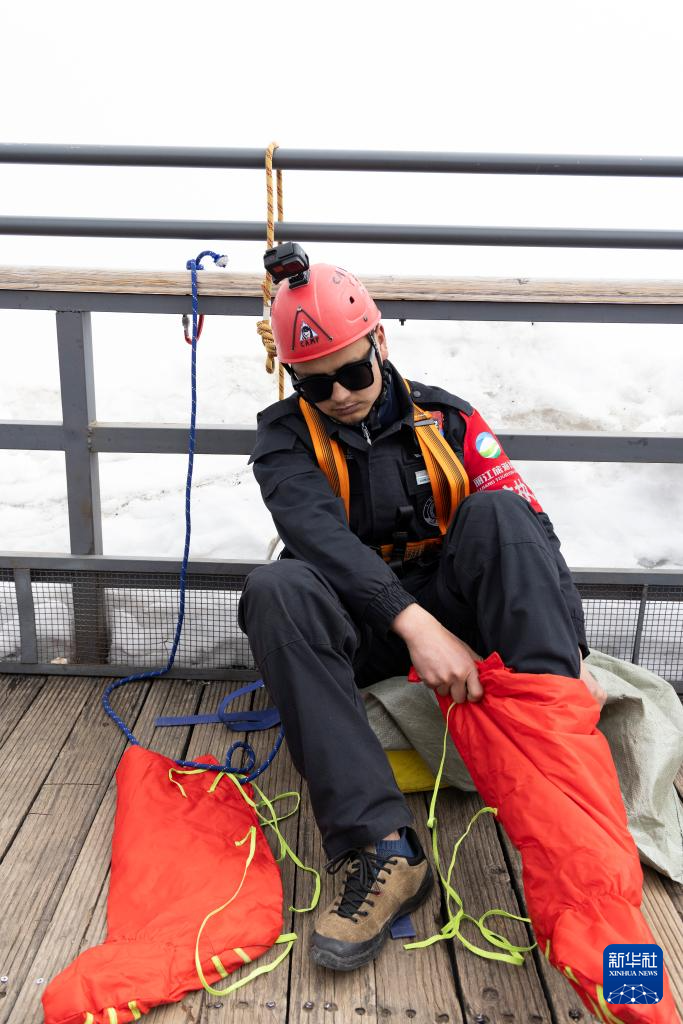 丽江玉龙旅游股份有限公司索道经营分公司景区部保安三组组员吕皓葳在下悬崖前穿鞋套(3月26日摄)。新华社记者 金立旺 摄